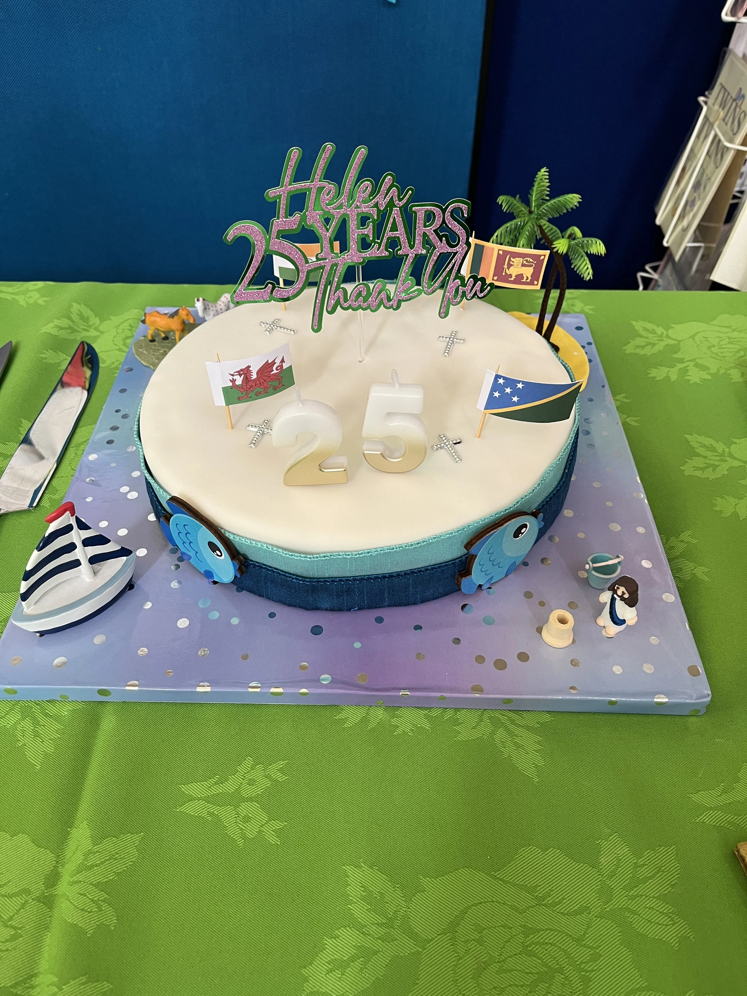 Priest-in-Charge, The Revd Canon Helen Griffiss, was celebrating 25 years in ordained ministry in this diocese, and 18 years before 2000 as an LLM. Helen's cake was decorated with some scenes from her ministry in India, Sri Lanka, Myanmar and The Solomon Islands, with a theme of Water running through it from her voluntary work in the desert of Rajasthan with Wells for India to her Blessing the Waters in Mudeford. The founders of the charity, Dr Nicholas Grey and feminist theologian, Professor Mary Grey, with whom Helen travelled in the desert, were able to be present to join in the celebrations.